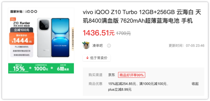 7月5日,有网友爆料称:“某平台iQOO Z10 Turbo参与满1000元减100元,Plus会员立减8.99元,国补减254.85元,实付低至1436.51元。”